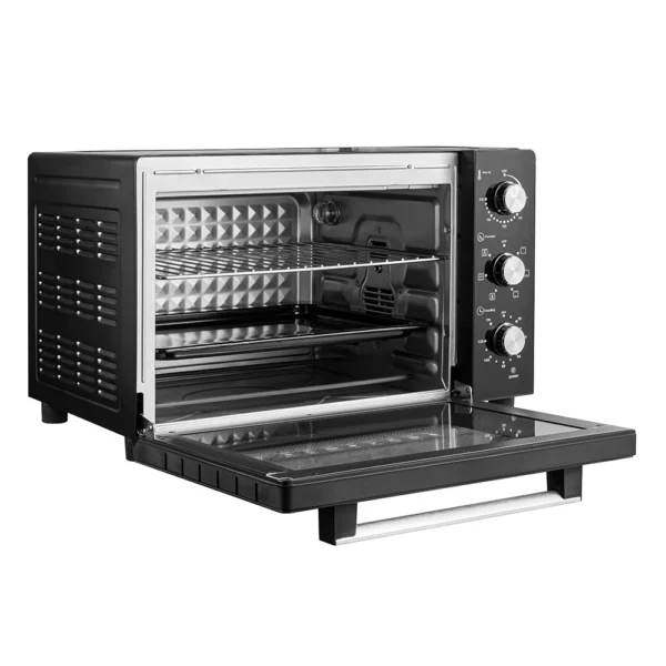 The AFRA Toaster Oven is a powerful and spacious appliance perfect for a variety of cooking tasks. With a 45L capacity and 1700W power, it provides ample space and strong performance for baking, roasting, and toasting. The oven’s temperature range is adjustable from 70°C to 230°C, offering flexibility for different recipes. The 120-minute timer with a bell ring helps ensure your food is cooked just right every time. Featuring multiple heating modes—off, upper heating, lower heating, and a combination of upper and lower heating—this oven can be used for a range of cooking styles. The double glass door ensures safe use and allows you to monitor your food while it cooks. The oven also comes with essential accessories including a bake tray, bake rack, and tray handle. Built with durable stainless steel heating elements, this toaster oven combines practicality with style for your kitchen.